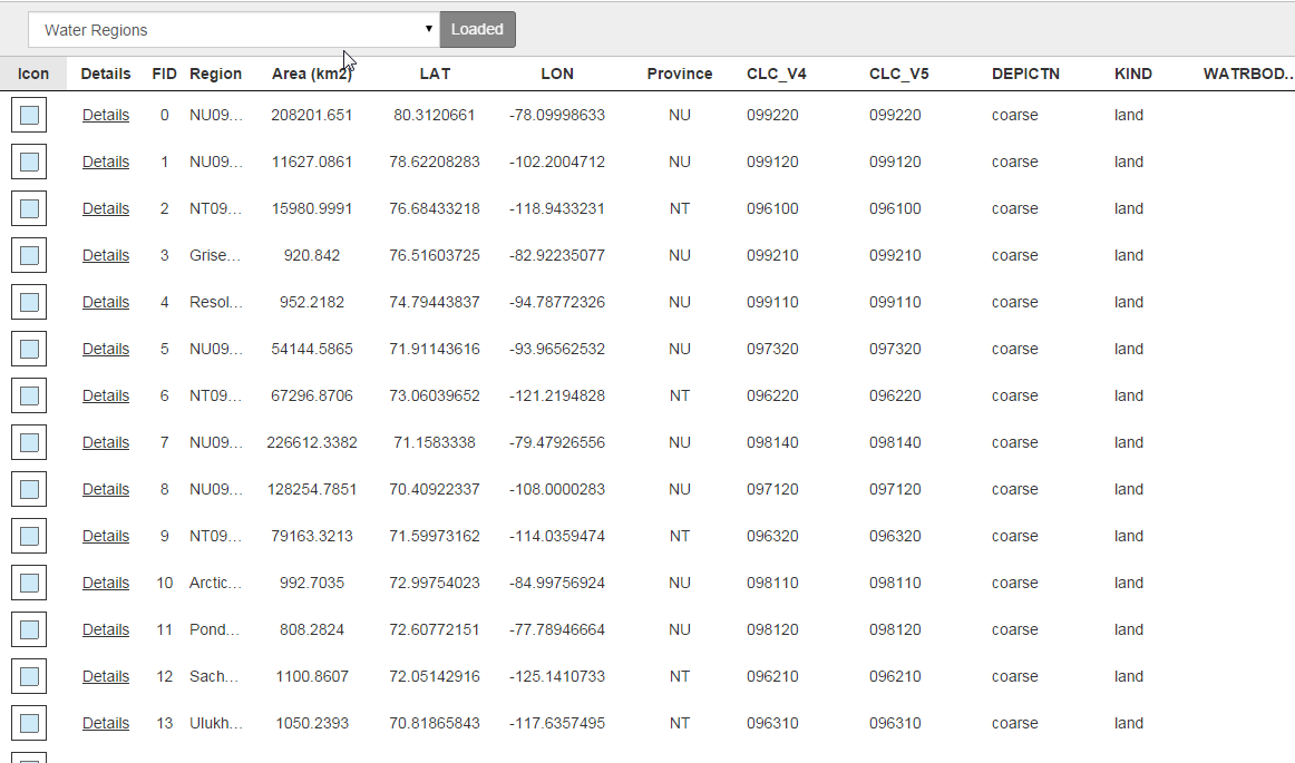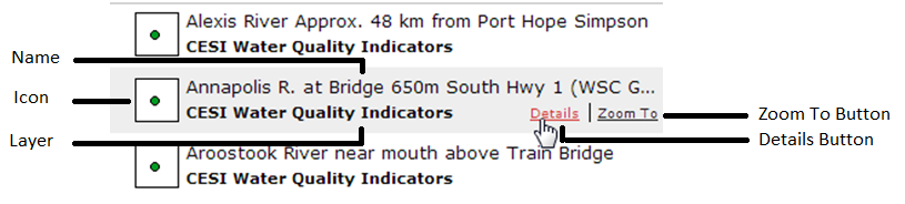 In the default datagrid summary mode, each row contains an image representing the feature on the map, the name of the feature, the layer the feature belongs to, as well as a “details” and “zoom to” button.