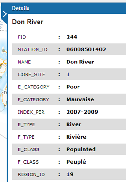 The default detail panel contains each field of the feature on a separate row with an alternating “zebra-pattern”. The default template iterates through each field in the feature and generates a list item for each field. The “zebra-pattern” is achieved by adding the class “wet-boew-zebra alterwg” to the list. The Wet Template would look for lists labelled with such class and style it accordingly.