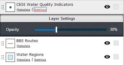 The default filter row contain a handle that enables the user to rearrange the order of the layers on the map, an icon representing the layer, the name of the layer, a metadata button that allows the user open a subpanel to view the metadata in that layer, a settings button that allows the user to adjust layer’s opacity if enabled in the config, and an “eye” and “box” toggle box that enables the user to toggle the layer visibility and layer bounding box visibility respectively.
